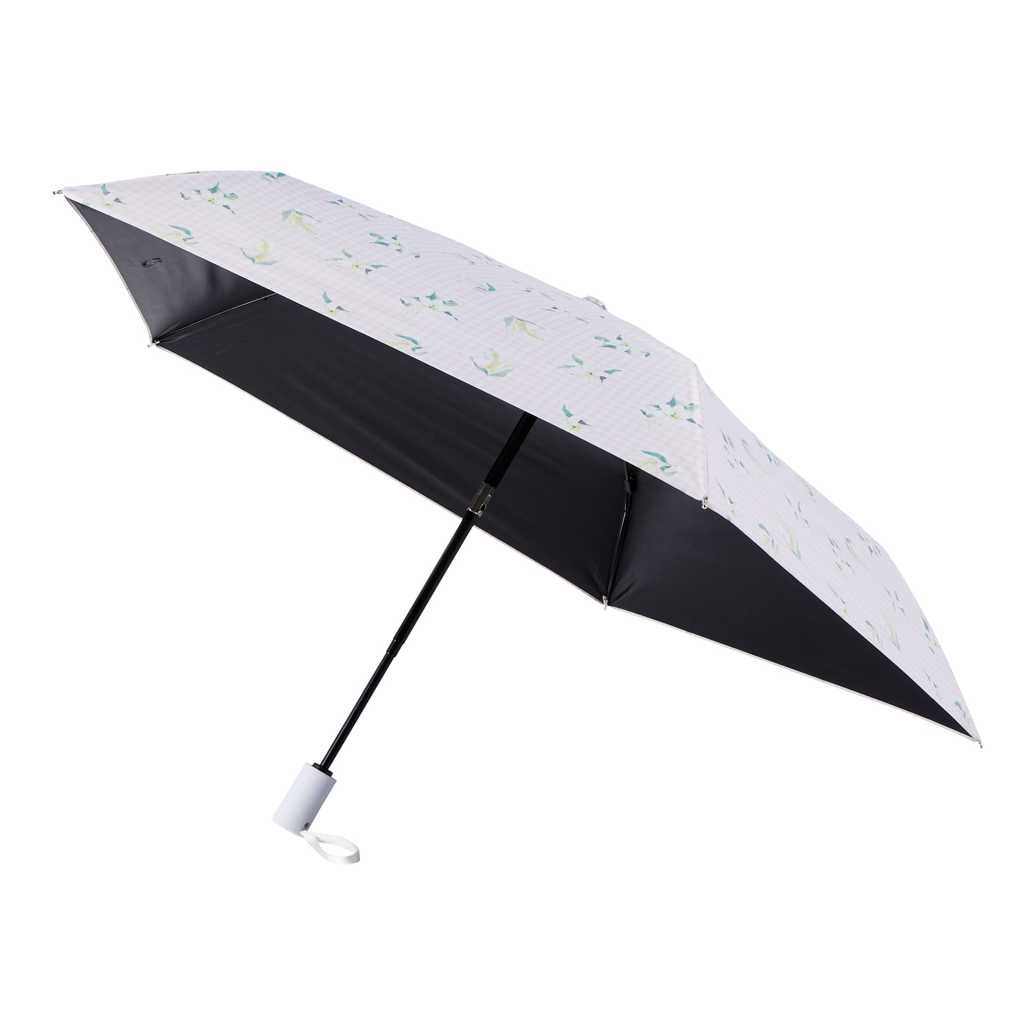 軽量生地に華やかなプリントをのせた軽量仕様日傘。生地の裏側にべたつかない加工を施しています。用途に合わせて選べる機能バリエーション。